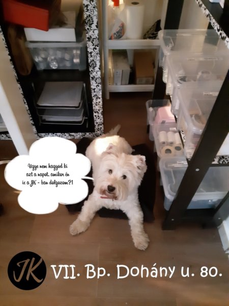 😉 De természetesen nem harap, nem ugat, nyugodt kis jószág ő és ma kora délutánig itt lesz velem! A képen éppen azt mondja: “Ugye nem hagyod ki azt a napot, amikor én is a JK – ban dolgozom?!” Hát, mindenki eldönti, eljön – e ma hozzánk